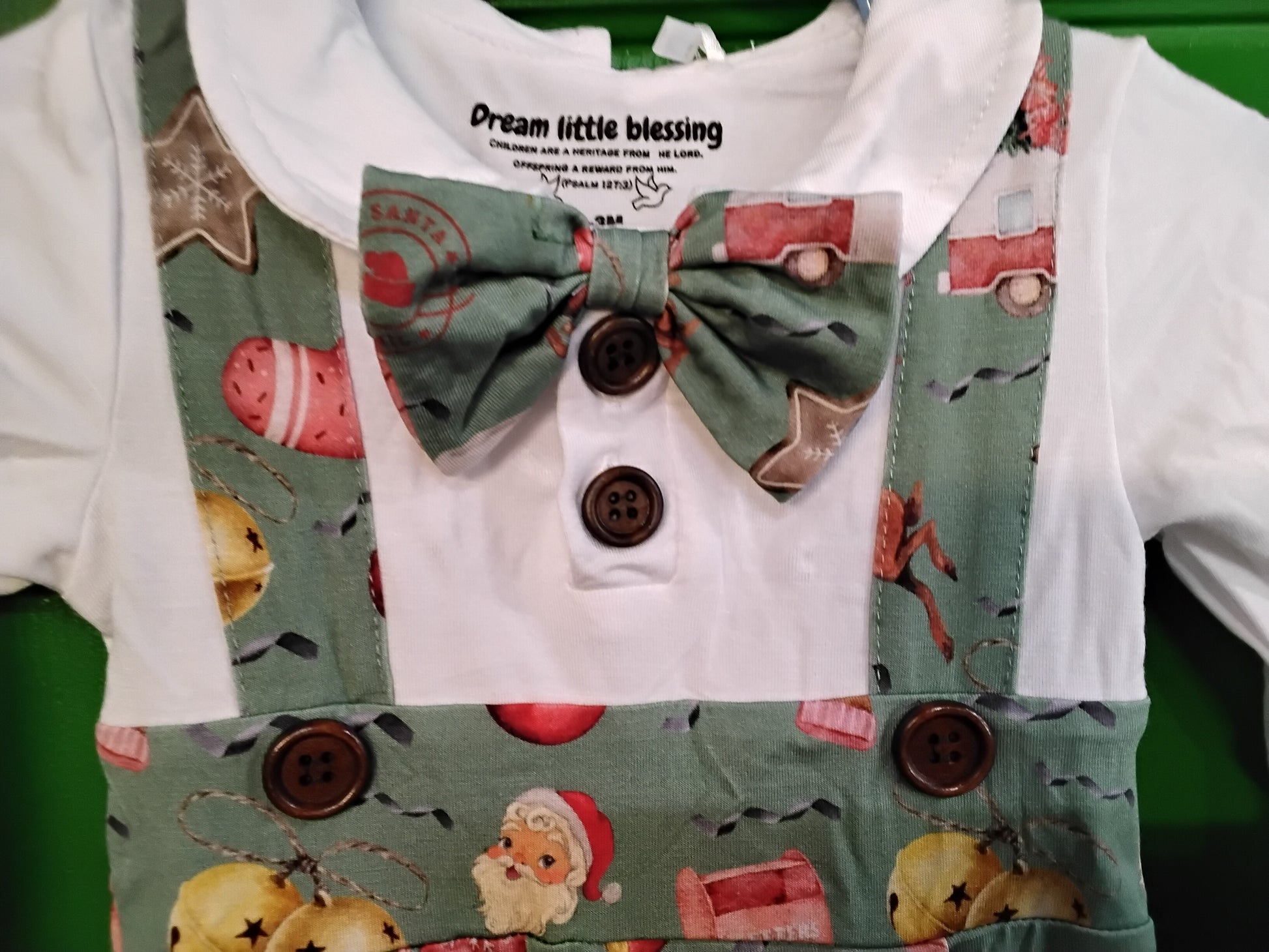 This holiday vintage design outfit/ sleeper is so super soft, stretchy and comfortable for your baby. Our sleeper has a double zipper for ease of changing a diaper or changing out of the sleeper between the legs. This handsome look of the coveralls with a bowtie reflecting images of what we remember or like about Christmas. So super cute.